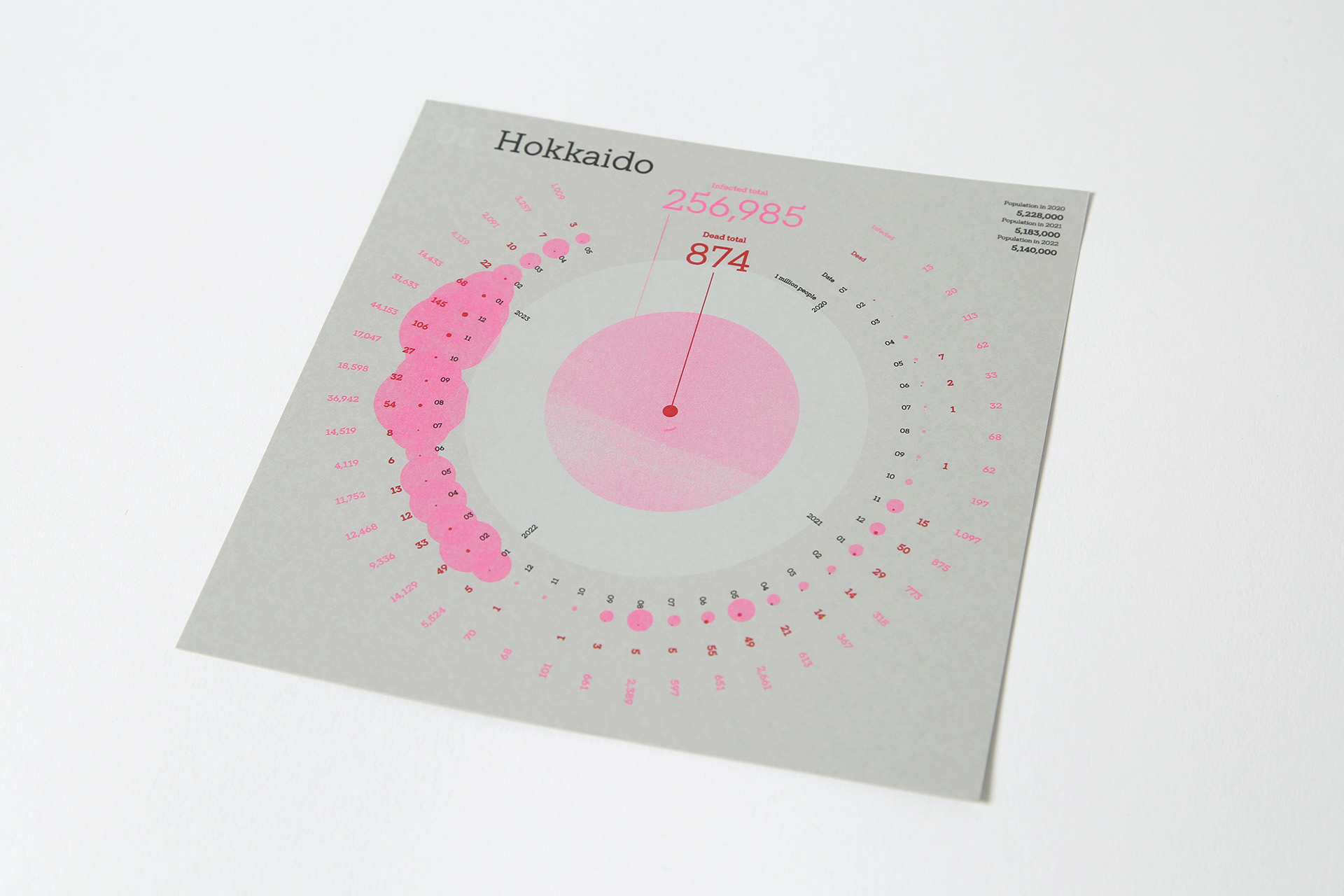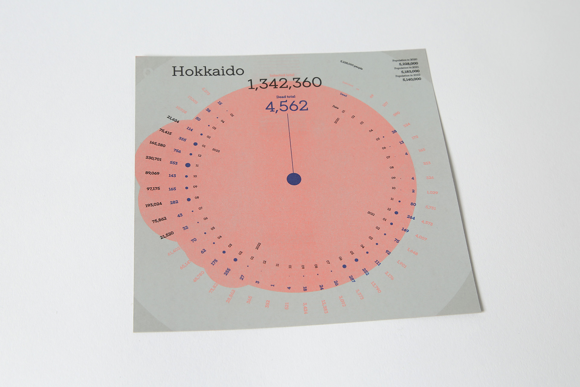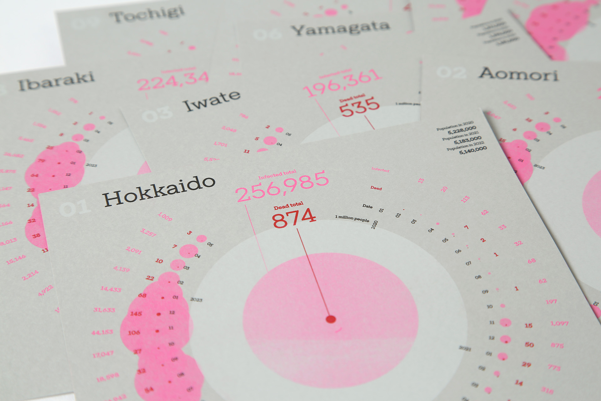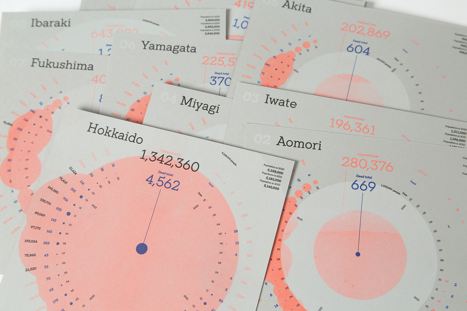 2020年1月から2023年5月までの、日本での新型コロナウイルスの感染者数・死者数を、都道府県別に視覚化しました。「100万人ごと」と「実数」でパートが分かれており、1つの都道府県につき1ページずつ同じ順番で並べ、いずれも、円が大きいほど数が大きいことを表しています。